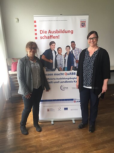 Am 25. April haben Katrin Birkenwald und Carola Koisser QuABB auf einer Veranstaltung der IHK Kassel zum Thema "Beschäftigung von Geflüchteten - Unterstützungsangebote in der Ausbildung" vorgestellt. Die Veranstaltung richtete sich an Vertreter und Vertreterinnen von Betrieben, die auf diese Weise mit dem Angebot der qualifizierten Ausbildungsbegleitung vertraut gemacht wurden und sich mit den beiden Beraterinnen austauschen konnten.