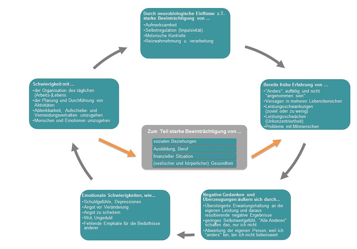 [4] Eigene Darstellung, in Anlehnung an Krause, Klaus-Henning/Dresel, Stefan/Krause, Johanna (2000): Neurobiologie der Aufmerksamkeitsdefizit-/Hyperaktivitätsstörung. In: Psycho 26, S. 199-208; ADHS-Zentrum München: ADHS bei Erwachsenen. Online im Internet: adhs-muenchen.net/pages/adhs-kinderjugendliche/adhs-bei-erwachsenen.php [Stand: 06.06.2014]; Selbsthilfegruppe Wunderkind. Online im Internet: www.selbsthilfegruppe-wunderkind.de/bedeutung-ads-adhs.html [Stand: 06.06.2014]; Heinz, Stephan: Kommunikation in der ADHS-Beratungspraxis. Online im Internet: www.vfp.de/verband/verbandszeitschrift/alle-ausgaben/58-heft-04-2012/354-kommunikation-in-der-adhs-beratungspraxis.html [Stand 06.06.2014].